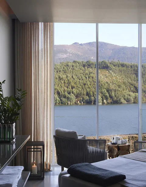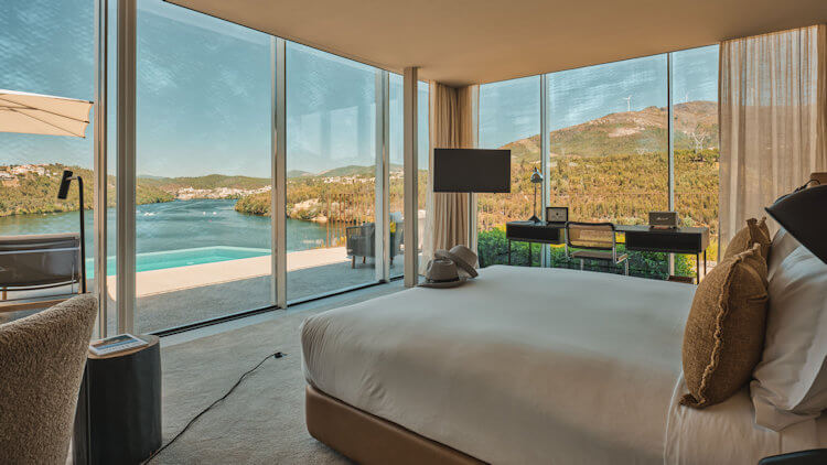 O hotel apresenta uma arquitetura que celebra a tradição da região, inspirada nos icônicos socalcos vinícolas. Os interiores são elegantes e confortáveis, permitindo que a paisagem exterior, com o rio Douro ao fundo, seja a verdadeira estrela. Cada quarto e suíte oferece uma visão privilegiada deste cenário, tornando a estadia uma experiência visual e sensorial. Com o Douro como fundo, convidam a simplesmente ser e estar, seja acompanhados por um livro, papel e caneta ou a contemplação que convida a desligar a mente.